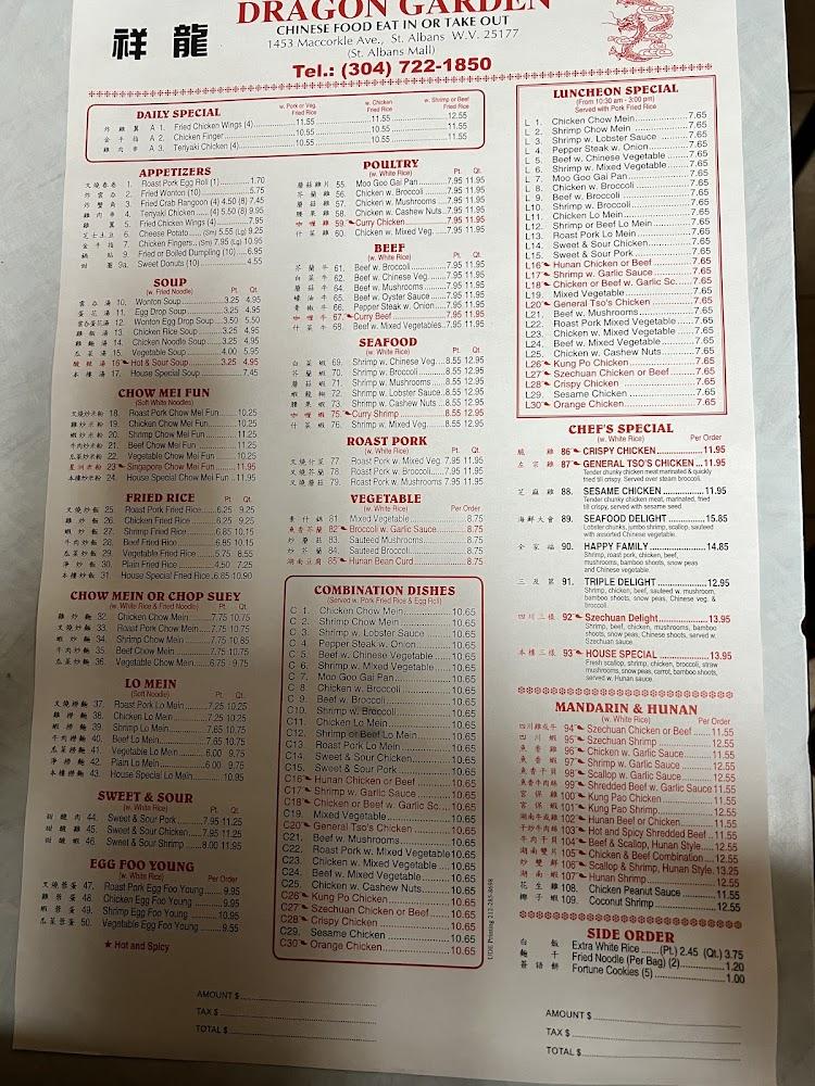 Welcome to Dragon Garden Buffet, your premier destination for delicious Chinese cuisine in St. Albans, WV. Located at 1453 MacCorkle Ave, we pride ourselves on offering a diverse menu that caters to all tastes, with everything from hearty noodle dishes to an extensive selection of teas. Enjoy a relaxed atmosphere that's perfect for solo dining, family gatherings, or brunch with friends. With options for dine-in, takeout, and delivery, we ensure flexibility to suit your needs. Accessibility is a priority, featuring wheelchair-friendly facilities. Join us for an unforgettable culinary experience and savor the flavors of China at an affordable price!